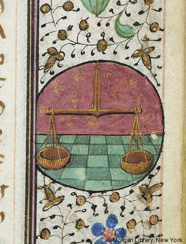 Zodiac Sign: Libra -- In medallion in right margin, scales, labelled LIBRA.
