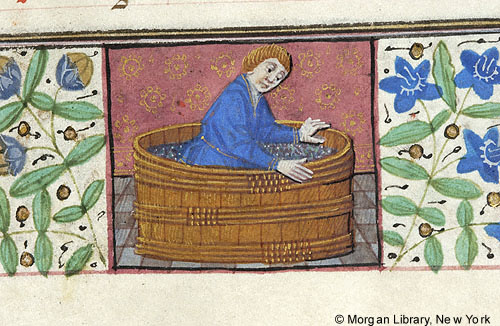 Month, Occupation: September -- In vignette in lower margin, man in vat crushing grapes.