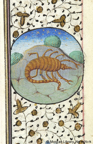 Zodiac Sign: Scorpio -- In medallion in right margin, scorpion, labelled SCORPIUS.