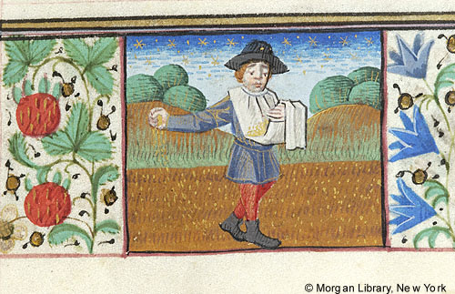 Margins decorated with foliate and floreate ornament. In lower margin, heraldic shield of Pierre Bosredont (quarterly, vair and gules).