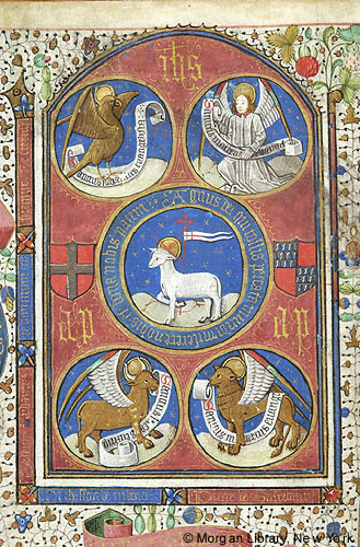 4) Evangelist symbol of Luke, ox, nimbed, winged, holding in mouth, scroll inscribed SANCTUS LUCAS EUANG(ELISTA)