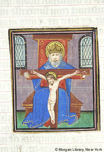 Trinity: Mercy Seat -- God, nimbed, wearing papal tiara, is seated on canopied throne holding tau cross on which is Christ, nimbed, bleeding from wounds, wearing short loin cloth, affixed with three nails. Dove of Holy Ghost is between them, near left shoulder of God. Scene in windowed room.