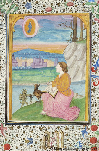 Evangelist, John: Scene, Devil stealing Inkpot -- On shore of Patmos, devil spills (?) ink from inkpot hung around neck of eagle. Evangelist John, holding quill in right hand, is seated at right with open book on lap. Virgin Mary, with joined (?) hands, appears in mandorla, above city in background.