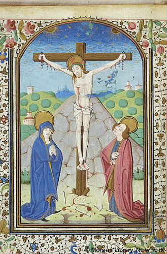 Christ: Crucifixion -- Christ, cross-nimbed, eyes closed, with crown of thorns, wearing short loin cloth, is affixed to cross with three nails. He is flanked above by sun and moon and below by Virgin Mary, nimbed and veiled, with joined hands and Evangelist John, nimbed, right hand on breast, gazing up toward Christ. Bones in foreground at foot of cross. Scene in hilly landscape with building and trees in background.