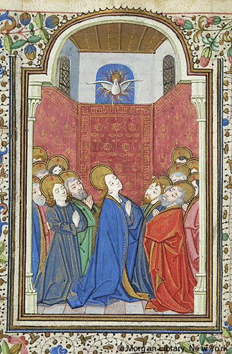 Pentecost -- Virgin Mary, nimbed, with joined hands, kneels and looks up. She is flanked by twelve Apostles, nimbed, each with tongue of fire on nimbus. All kneel, some with joined hands. Above, dove of Holy Ghost, nimbed, hovers amid flames. Scene in windowed room with drapery background, inscribed EMITTE SPIRITUM TUUM ET CREABUNTUR ET RENOVABIS FACIEM TERRE.