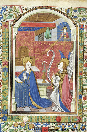 In background is draped altar below canopy with retable with relief of angel standing next to God, crossed projecting nimbus, right hand raised in blessing, possibly holding cross surmounted globe in left hand. Behind altar is tapestry inscribed ECCE ANCILLA DOMINI FIAT MICHI SECUNDUM and AVE GRACIA PLENA DOMINUS TECUM. Scene within windowed room with wooden ceiling.