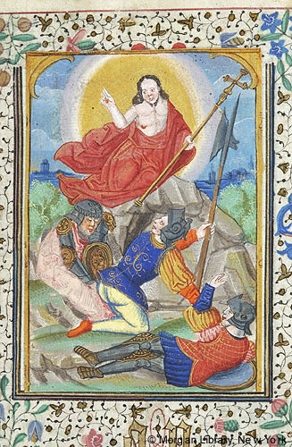 Christ: Resurrection -- Christ, nimbed, raising right hand in blessing, holding cross staff in left hand, partially draped, stands in mandorla atop rocky outcrop. Before Him are three soldiers, one asleep, the other two looking toward Him, one holding halberd. Scene in landscape with trees, buildings in background.