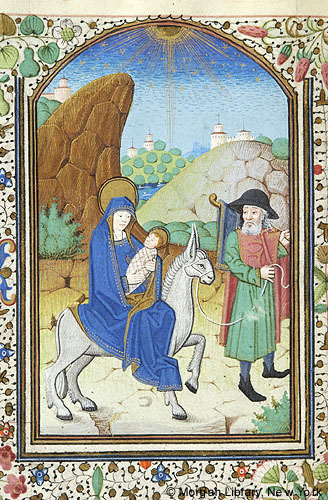 Christ: Flight into Egypt -- Virgin Mary, nimbed and veiled, is seated sideways on bridled ass, holding swaddled Christ Child, nimbed. Joseph the Carpenter, wearing hat, walks before ass, holding reins with right hand and, with left hand, draped pedum over left shoulder. Sun or star above emits rays. Scene in landscape with hills, towers, building, trees, and body of water in background.