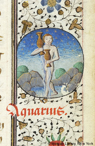 Zodiac Sign: Aquarius -- In medallion in right margin, Aquarius stands in stream pouring water from vase held in each hand.