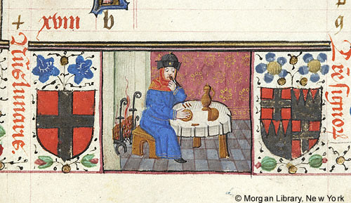 Month, Occupation: January -- In vignette in lower margin, man wearing hood and hat, holding right hand to lips, is seated with his back to fire, on bench, at draped table on which is covered vessel, loaf (?), and knives (?). Vignette is flanked by two heraldric shields, one of Knights of Rhodes (gules, a cross argent) and the other, incorporating Knights of Rhodes (quarterly, 1 and 4 gules, a cross argent, 2 and 3 argent, a chief dancettee gules).