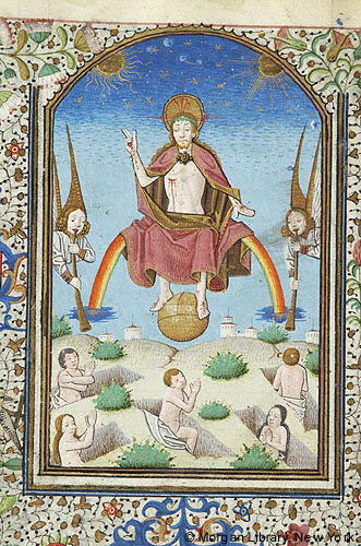 Christ: Last Judgment -- Christ, with cross projecting nimbus, raising right arm in blessing, wearing crown of thorns, partially nude, displaying bleeding wounds, is seated on rainbow with feet on globe. He is flanked above by two suns or stars emitting rays, and below by two angels playing horns. Below Him, three men, one with arms crossed on breast, and one with joined hands raised, and two women, one with joined hands raised, and the other with joined hands, all stand in graves. Scene in hilly landscape with bushes and with buildings in background.