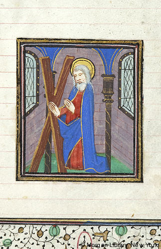 Saltire cross, next to Andrew, nimbed, both arms extended, standing in the center of three arches, and flanked by two columns. Scene in windowed room.