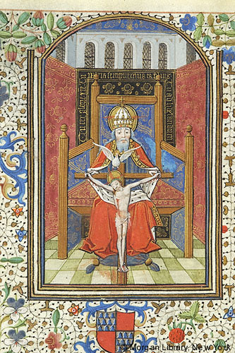 Trinity: Mercy Seat -- God, nimbed, wearing cross surmounted papal tiara is seated on throne supporting cross to which Christ, cross projecting nimbus, wearing short loin cloth, is affixed with three nails. Hovering between them is dove of Holy Ghost, nimbed. Throne is surrounded by three sections of tapestry; the center section is inscribed TU REX GLORIE CHRISTE TU PATRIS SEMPITERNUS ES FILIUS TU AD LIBERANDUM. Scene in windowed room.