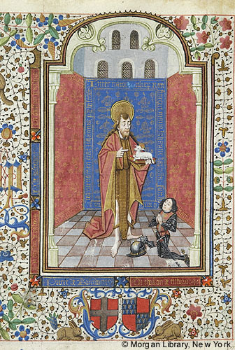 John Baptist, decorated nimbus, wearing garment of animal skin with head, indicates with right hand Lamb of God, cross projecting nimbus, lying on book held with his left hand. Kneeling before him is donor, Pierre de Bosredont with joined hands, sword at his waist, helmet and gauntlet on floor beside him. Figures in windowed room surrounded by three inscribed tapestries: 1) ELIZABETH ... ET MULTUM; 2) INTER NATOS MULIERUM NON SURREXIT MAIOR IOHANNE BAPTISTA FUIT HOMO MISSUS A DEO CUI NOMEN ERAT IOHANNES (from versicle and response of Suffrage based on John 01:06); 3) ZACHARIA ... NATIVITA[...]