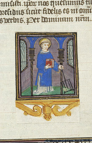 Margins decorated with floreate ornament, including strawberry, and inhabited by rabbit. In lower margin, heraldic shield of Hospitallers (gules, a cross argent). Text, Suffrages.