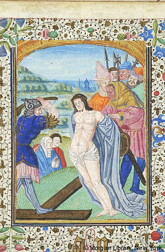 Christ: Crucifixion, stripped of Garments -- Soldier, wearing helmet, raising club in right hand, his right foot on cross on ground, faces Christ, rayed cross as nimbus, with crown of thorns, wearing short loincloth, bleeding from wounds on head and torso. Behind Him, man wearing hood, with sword and buckler at his waist, removes garment from Christ. They are flanked behind by Virgin Mary, wearing wimpled veil, with joined hands, and Evangelist John, both nimbed, and by group of men holding weapons including halberd and spear. Scene in landscape with hills and city in distance.