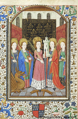 Martha of Bethany, nimbed, holds palm in right hand. Margaret of Antioch, nimbed, holds palm in right hand, and cross, and tether attached to dragon with left hand. Catherine of Alexandria, nimbed and crowned, holds palm in right hand, and sword in left hand, her right foot on broken wheel on floor. Barbara of Nicomedia, nimbed, holds tower in right hand and palm in left hand. Christina of Bolsena, nimbed, holds lamb (?) in basket (?) with both hands, the palm in left hand. Figures stand in windowed room before three tapestries, the center one inscribed SANCTUM VIRGINUM MARTYRUM KATHERINE MARGARETE MARTHE CHRISTIANE ET BARBARE.