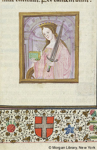 Catherine of Alexandria, crowned, holding book in right hand, upraised sword in left hand, stands next to wheel (only partially visible) in aedicule.