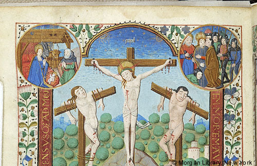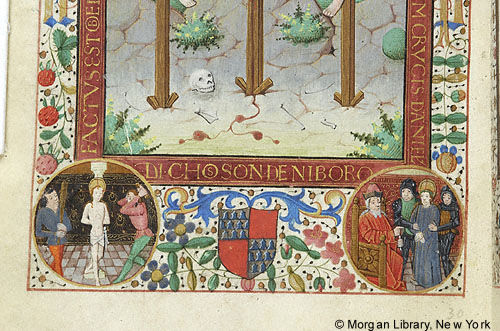 Border inscribed FACTUS EST OBEDIENS USQUE AD MORTEM MORTEM AUTEM CRUCIS DANIEL from NT, Philippians 02:08, and DI CHOSSON DE NIBORO, motto of Pierre de Bosredont.