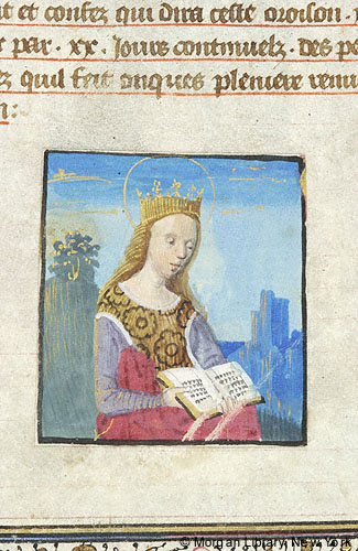 Female saint, nimbed and crowned, seated holding open book with both hands. Hill and city (?) in background.