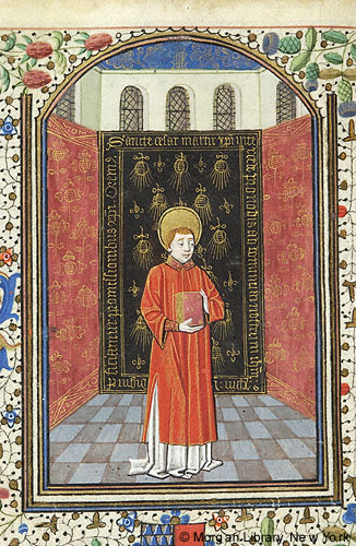 Caesarius, nimbed, holding book, wearing deacon's vestments, stands in windowed room before tapestry inscribed SANCTE CESAR MARTIR CHRISTI INTERCEDE PRO NOBIS AD DOMINICUM NOSTRI IHESUM CHRISTUM DIGNI EFFICIAMUR PROMISSIONIBUS CHRISTI OREMUS.