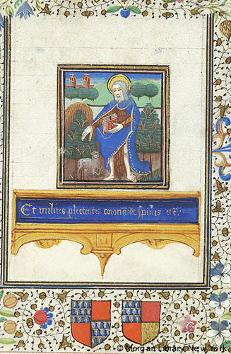 Miniature on top of bracket, with unrelated inscription, ET MILITES PLECTENTES CORONAM DE SPINIS ET CAETERA.