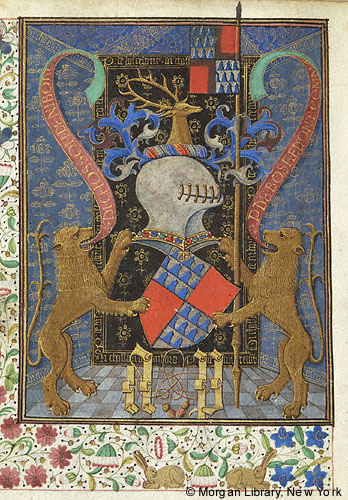 Crest of bust of stag surmounting helmet on heraldic shield of Pierre de Bosredont (quarterly, vair and gules), flanked by two lions rampant, holding helmet and shield, with scrolls inscribed DI CHOSSON DE NIBORO and P DE BOSREDONT emerging from their mouths. Between forelegs of right lion, bannered spear with arms of Pierre de Bosredont. Below, monogram of initials A and P linked by love knot. In background, tapestry inscribed P DE BOSREDONT DI CHOSSON DE NIBORO, repeated around border.