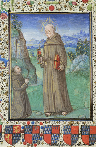 Margins decorated with floreate ornament. In lower margin, heraldic shields of members of Bosredont family: Guillaume (quarterly, vair and gules), Iehan (quarterly, 1 and 4 vair; 2 gules a lion rampant ; 3 gules), George (quarterly, 1 and 4 vair; 2 gules a cross patty argent; 3 gules), Pierre (quarterly, 1 and 4 vair; 2 gules a label 3 points azure; 3 gules), Antoine (quarterly, vair and gules), Pierre (quarterly, vair and gules).