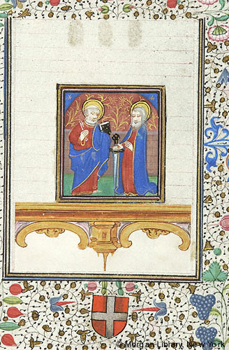Margins decorated with foliate and floreate ornament, including grapevine. In lower margin, heraldic shield of Hospitallers (gules, a cross argent). Text, Suffrage.
