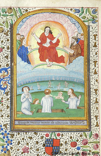 Christ: Last Judgment -- Amid clouds, Christ, rays as crossed nimbus, draped in mantle, arms raised, is seated on arc, with feet resting on another arc. At left are Virgin Mary, crowned, hands extended toward Christ; two men stand behind her. At right are John Baptist (?), arms extended toward Christ; two men stand behind him. Below, souls emerge from graves, some nude, some clothed, some with hands joined, some with hands raised. Frame is inscribed SURGITE MORTUI UENITE AD IUDITIUM.