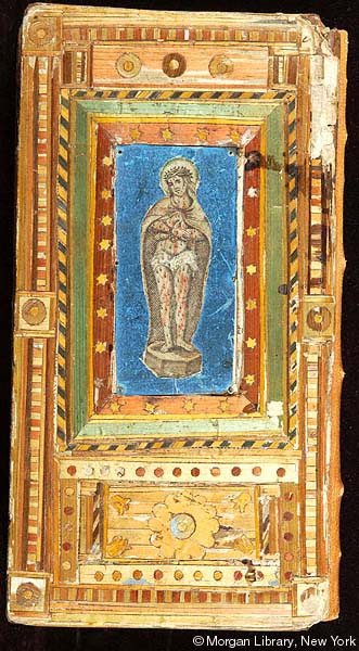 Christ: of Sorrows -- Christ, nimbed, wearing crown of thorns, short loin cloth, and mantle, bleeding from wounds, stands with hands crossed on his breast. Central panel framed by rectangular bands enclosing stars and geometric ornament.