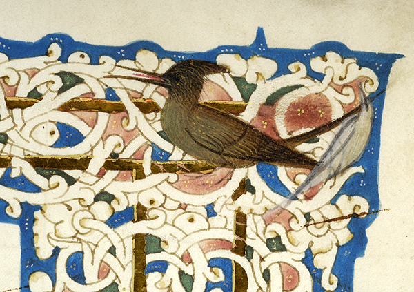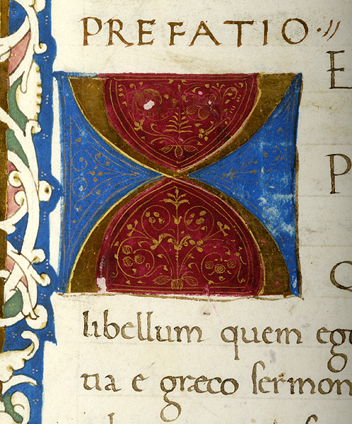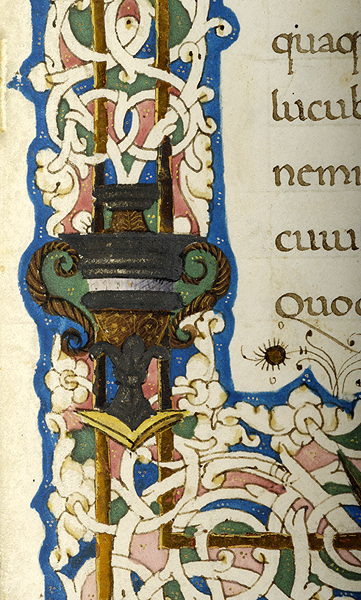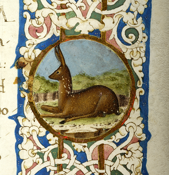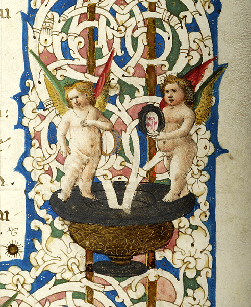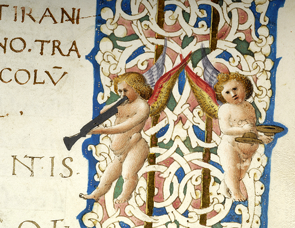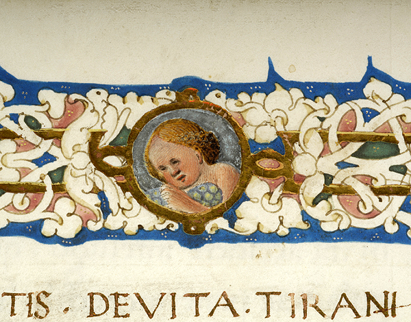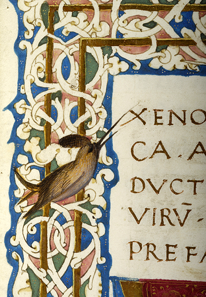 In upper margin, medallion enclosing bust of putto and two birds, one possibly hummingbird. In left margin, two birds, possibly hummingbird and goldfinch, and vase. In right margin, pair of putti, one blowing trumpet, the other playing cymbals, a medallion enclosing recumbent deer, and another pair of putti standing on vase, one holding drum, the other holding tambourine. In lower margin, pair of putti, each holding cornucopia and seated on dolphins, flank wreathed blank medallion. Margins decorated with floreate and vinescroll ornament. Illustrated margins at beginning of Xenophon, De Vita Tirannica, text starting with decorated inital X.
