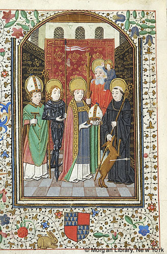 Margins decorated with floreate ornament, inhabited by rabbit. In lower margin, heraldic shield of Pierre de Bosredont (quarterly, vair and gules).